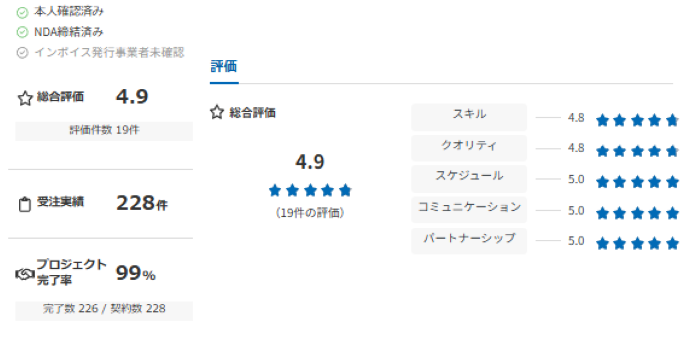 クライアント様からも複数の評価をいただき、★4.9と高評価を維持しています。